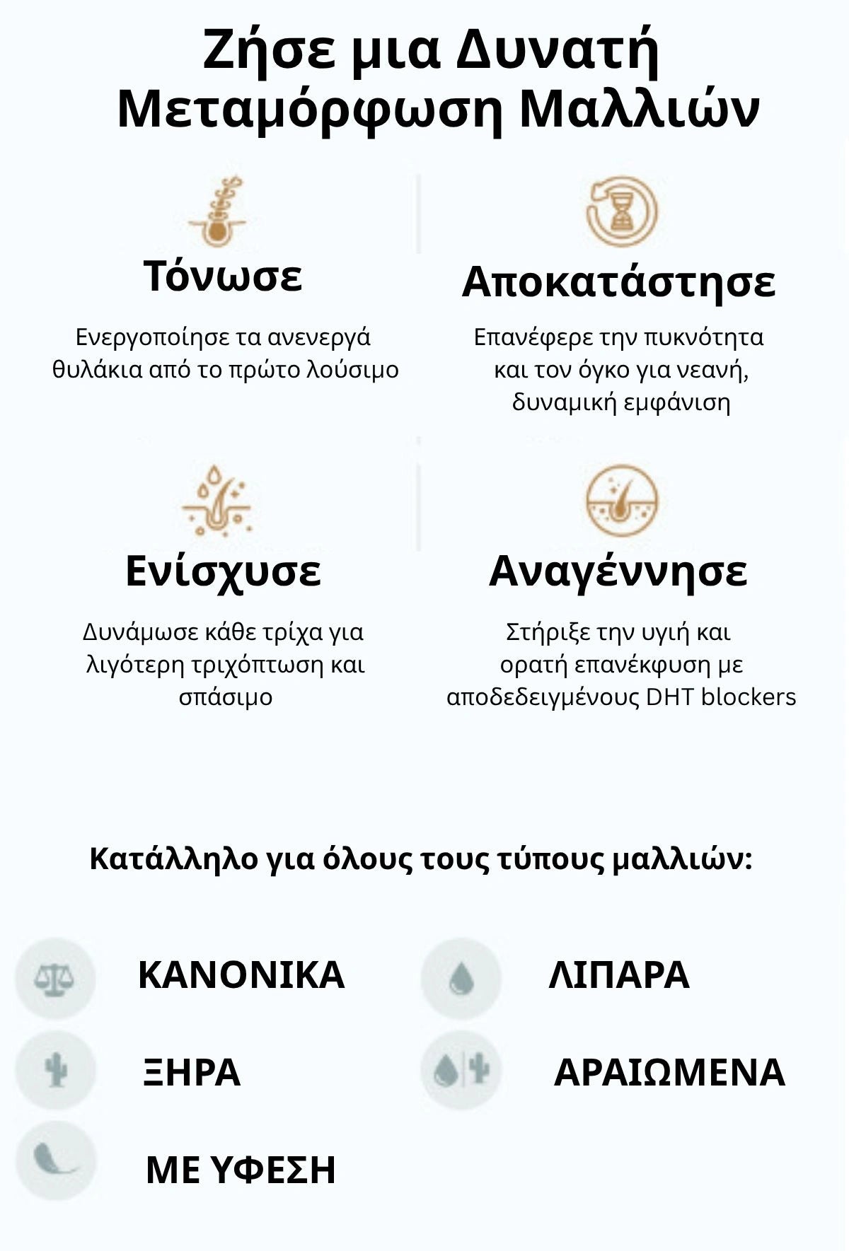 Μια απλή ρουτίνα 90 ημερών (2–4 φορές/εβδομάδα) που βοηθάει στην καταπολέμηση της τοπικής DHT, ενισχύει τη μικροκυκλοφορία και δίνει στα μαλλιά πιο πυκνή εμφάνιση. Τα αποτελέσματα ποικίλουν.